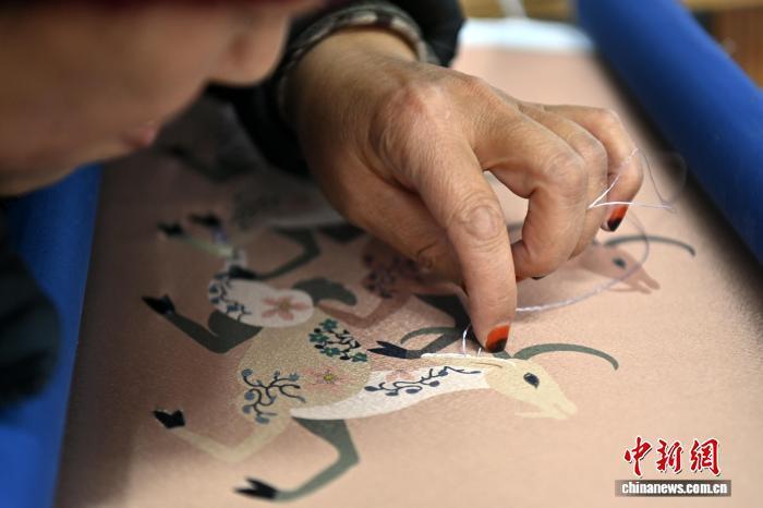 1月22日,在位于甘肃临夏回族自治州东乡族自治县的锁南镇城南社区刺绣弊端内,东乡族绣娘们正在制作背包、挂件等刺绣居品。图为东乡绣娘进行刺绣针法训导。中新社记者 九好意思旦增 摄