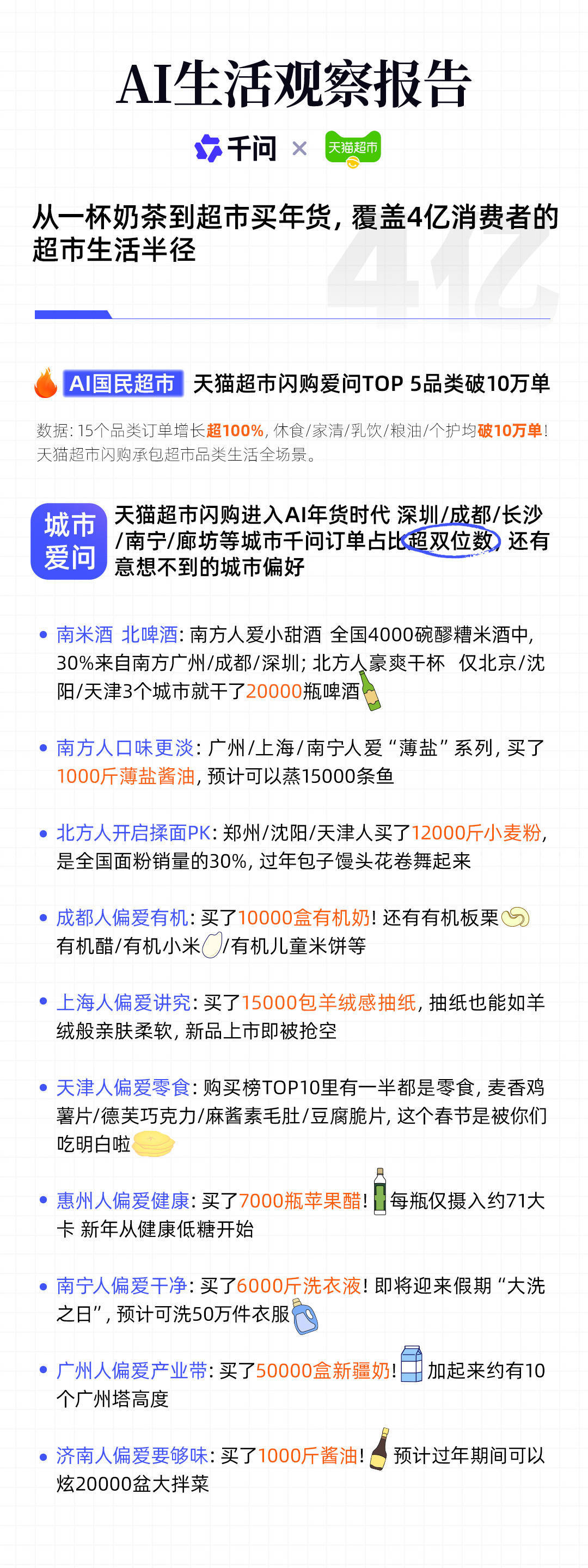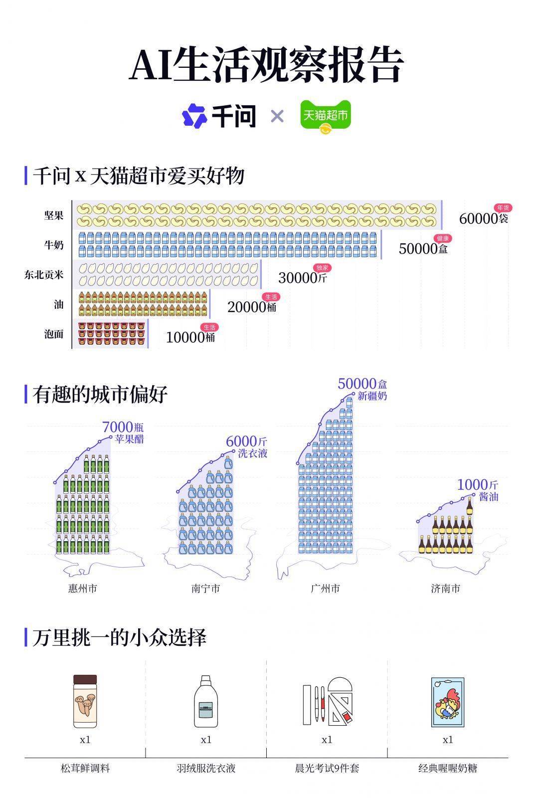 千问聚合猫超、盒马、闪购,共同挖掘了更多酷爱数据,举例,千问用户最羡慕的热点单品,1000多吨鸡蛋、156万60岁以上用户、南北城市的不同爱好、独到的小酒经济、万里挑一的小众商品等等,整理了这份《AI生计不雅察汇报》,知悉AI时间的新浮滥。