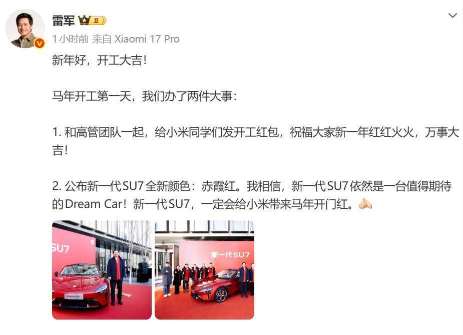 24日上昼9点33分,小米集团创办东说念主、董事长兼CEO雷军在酬酢媒体发文称,马年开工第一天办了两件大事,一是为职工发开工红包,提振团队士气,二是厚爱公布新一代 SU7 全新配色 “赤霞红”。从雷军晒出的像片不错看出,雷军和小米高管团队在小米科技园为职工派发开工红包。算作小米开工保留面貌,雷军躬行发红包已不竭多年,通过小米职工晒出的红包不错看出,红包金额在10-100元之间。