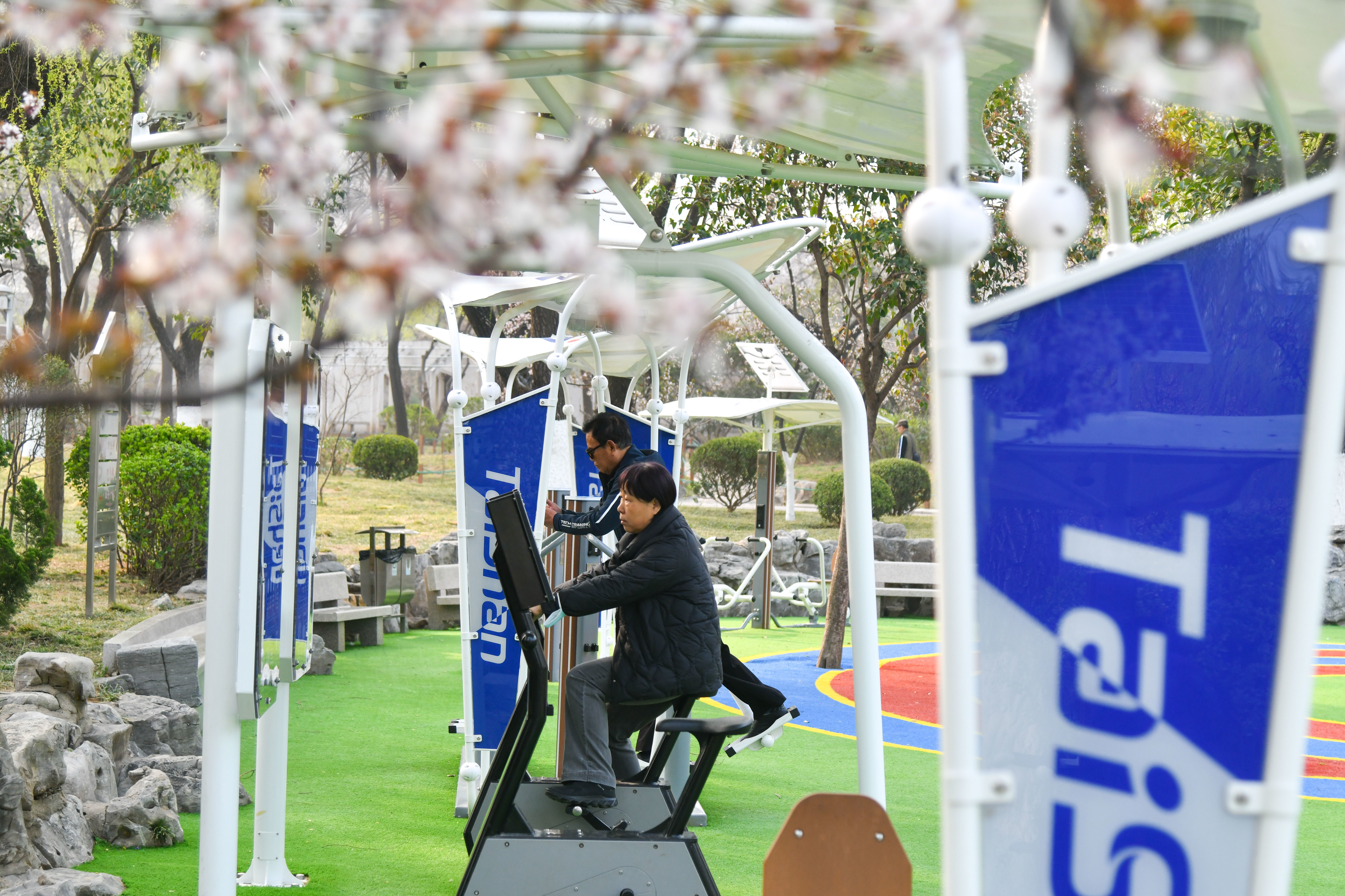 济南泉城公园内,健身艳羡者在全龄智能健身区施行(3月22日摄)。新华社记者 朱峥 摄