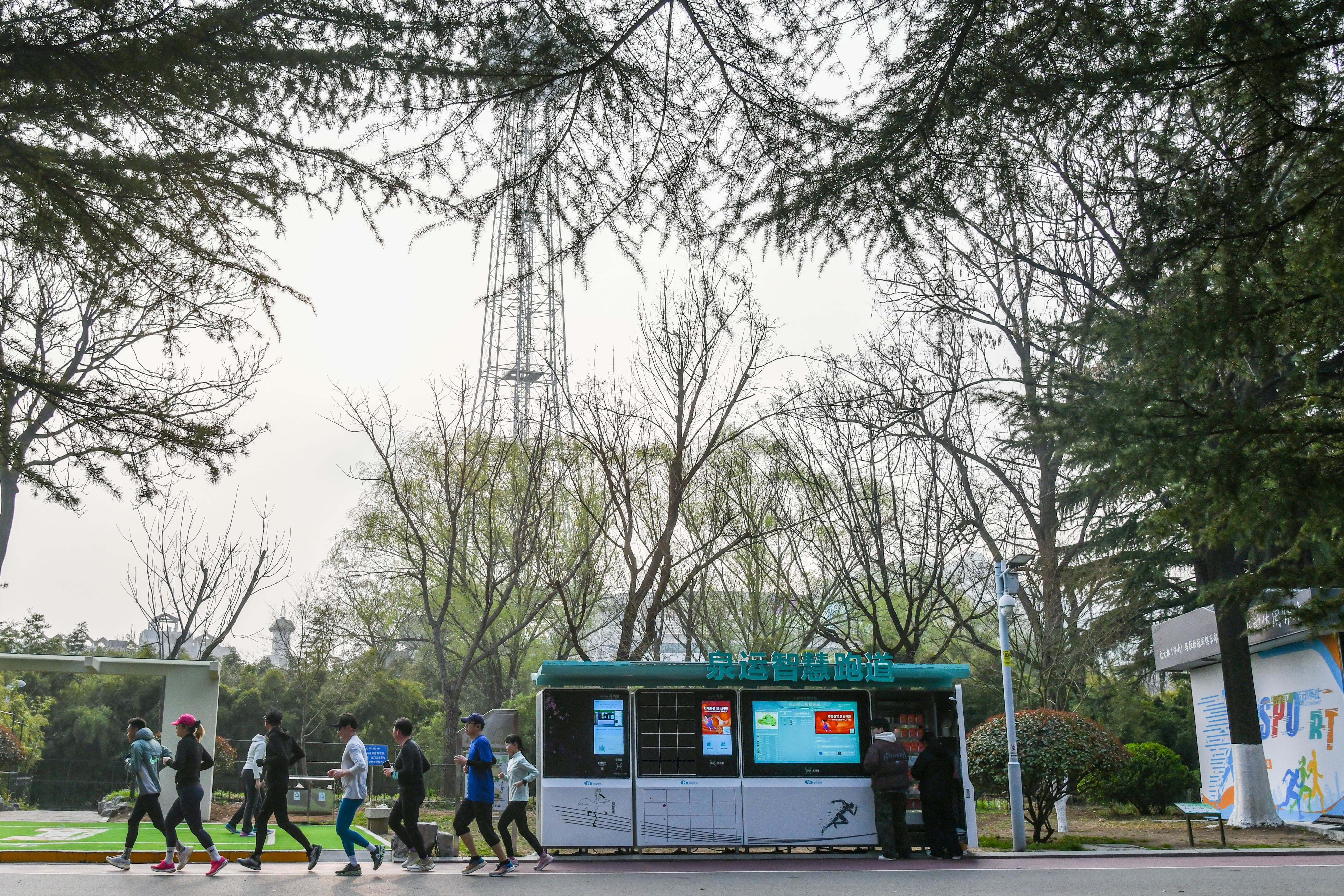 济南泉城公园内,健身艳羡者在健身步说念跑步(3月22日摄)。新华社记者 朱峥 摄