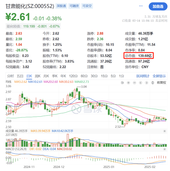 截止2月14日收盘,甘肃能化股价为2.61元/股,总市值约为140亿元。