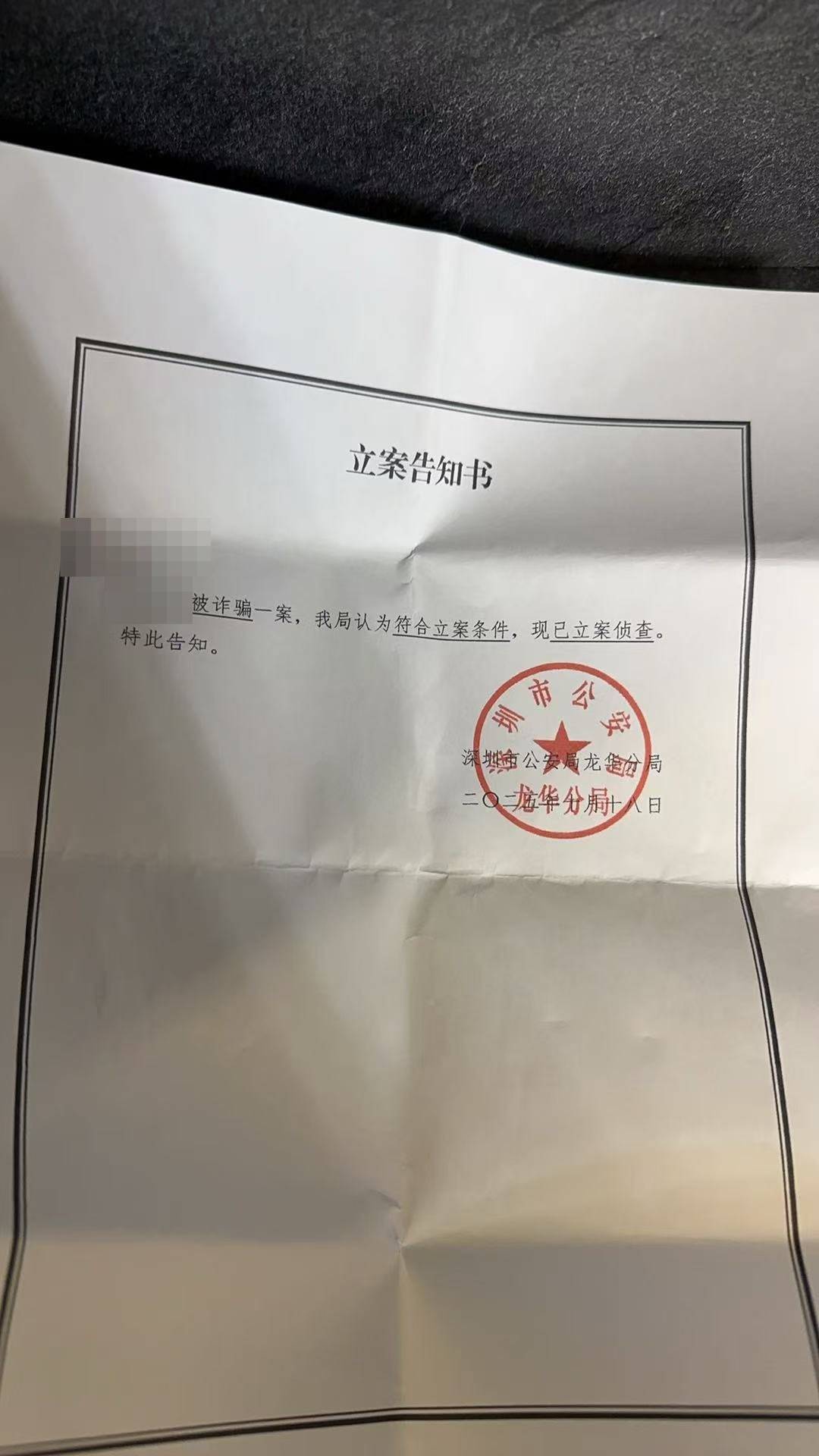 冯女士告诉红星新闻,意志到受骗后,她已向警方报案。深圳市公安局龙华分局的立案见知书清晰,冯女士被诱拐一案,警方认为相宜立案圭表,已立案考查。题名日历为10月18日。