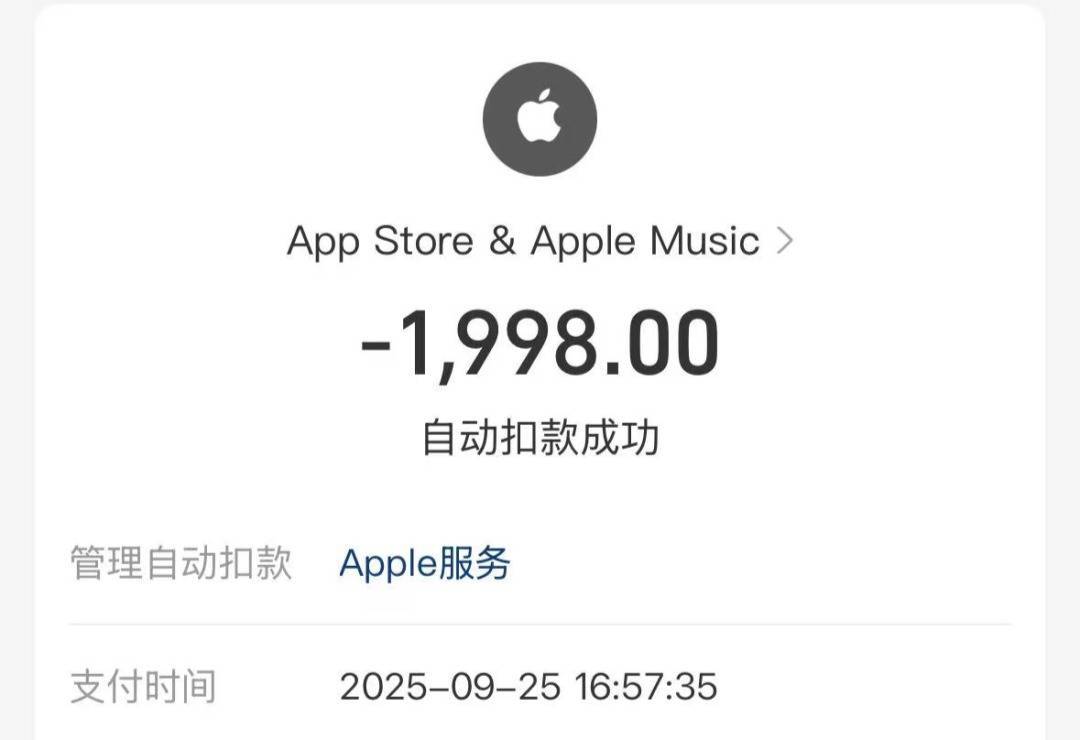 冯女士向记者出示的苹果商店扣款申报清晰,9月25日16时57分,冯女士支付宝绑定的银行卡在1分钟内先后被扣走了两笔金额为1998元的款项。