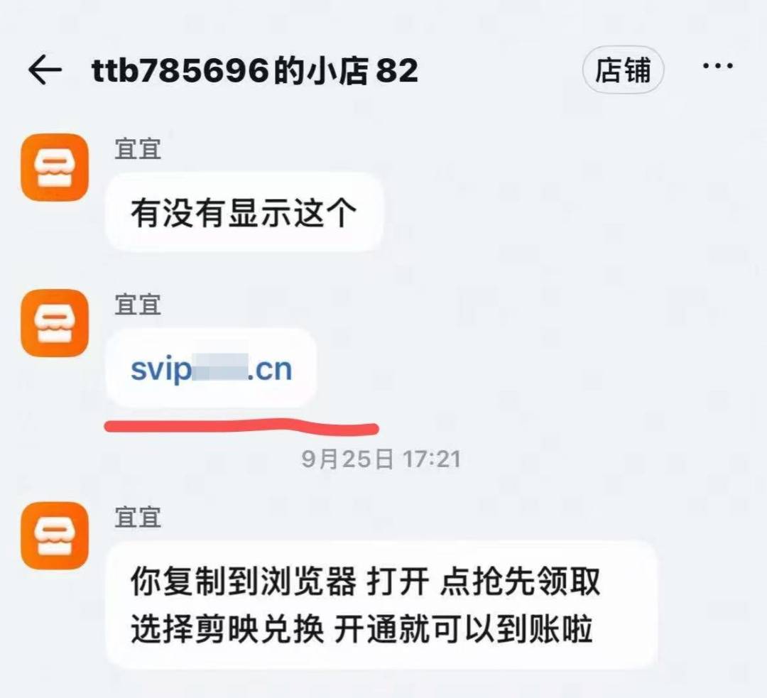 记者在该电商平台搜索冯女士提到的店铺,发现店铺已不存在。搜索要津词“剪映会员”后,记者又找到一家名为“tbs1470501的小店52”的店铺,该商家售卖商品包括剪映会员和宝宝巴士会员。记者将剪映会员购买纠合发给商家并商榷:“怎样充?”商家商榷记者是否为苹果用户,在得到细目修起后发来了一条名为“vip***.cn”的纠合,让记者复制到浏览器怒放。发稿前,该店铺已搜索不到。